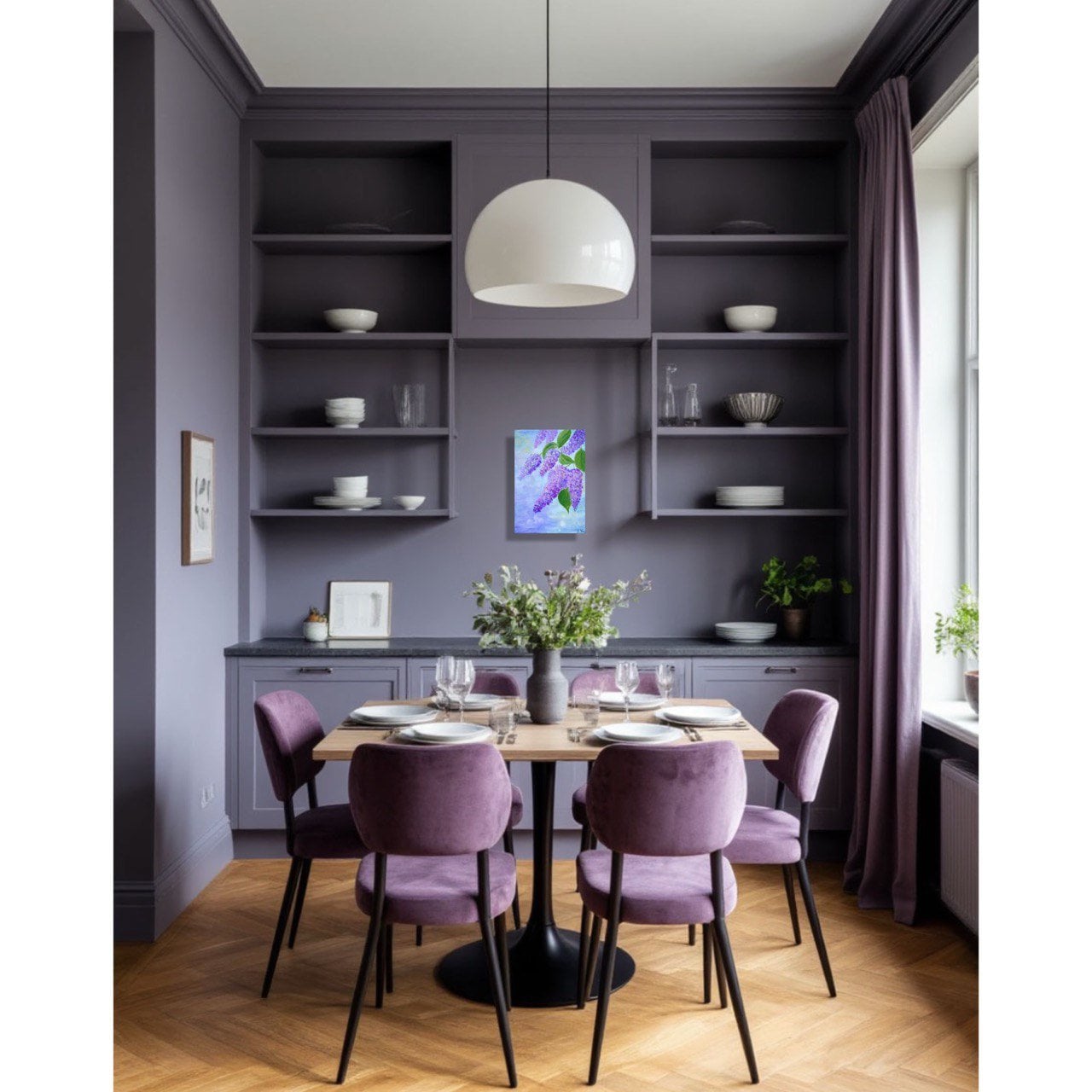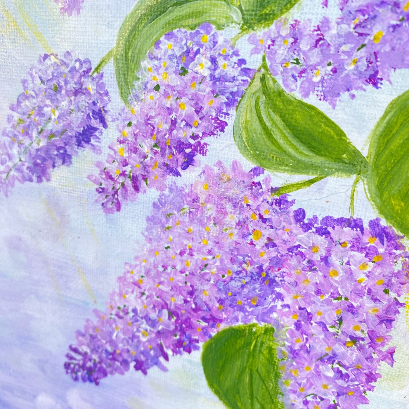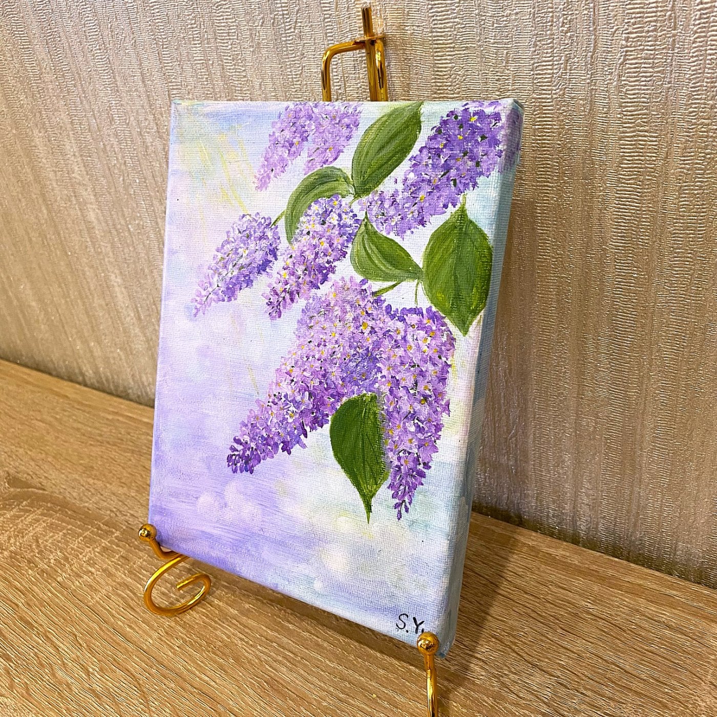 Эта картина относится к серии «Весеннее настроение». В этой миниатюрной работе весна представлена как драгоценная дымка лилевых оттенков, скользящая меж зелёных листьев. Диагональная композиция гроздей сирени создаёт ощущение движения — словно ветер приносит ароматы и обещание долгожданного тепла. Фон — лавандовый и голубоватый, с тёплыми солнечными всплесками, которые придают картине свет и лёгкость. Техника — мягкие импрессионистские мазки, передающие мгновение пробуждения природы. Идеально для интерьеров, где нужна спокойная весенняя энергия и романтический настрой, а так для весенних подарков любимым. Торцы прокрашены и являются продолжением картины. Единственный экземпляр, имеется сертификат подлинности.