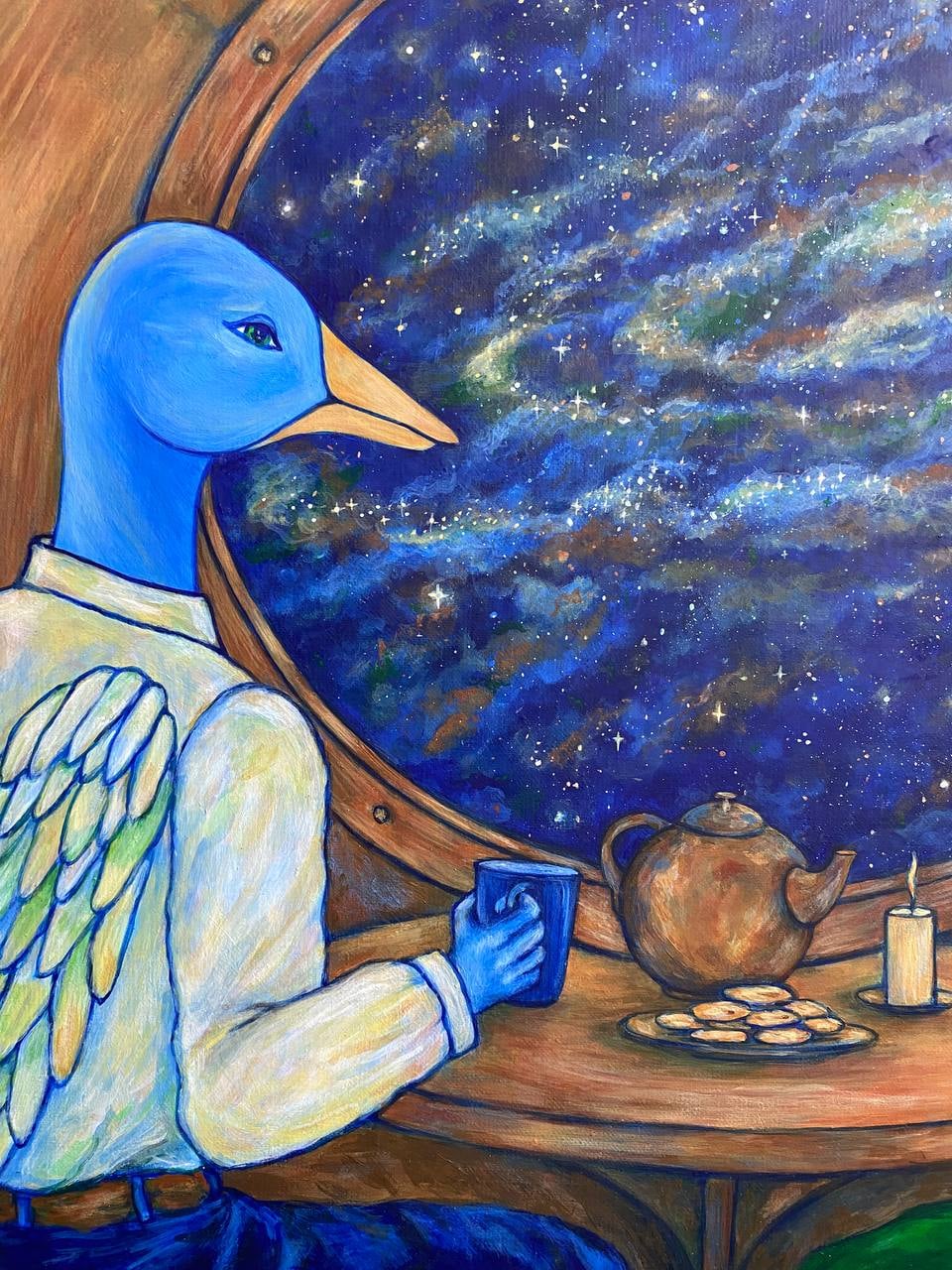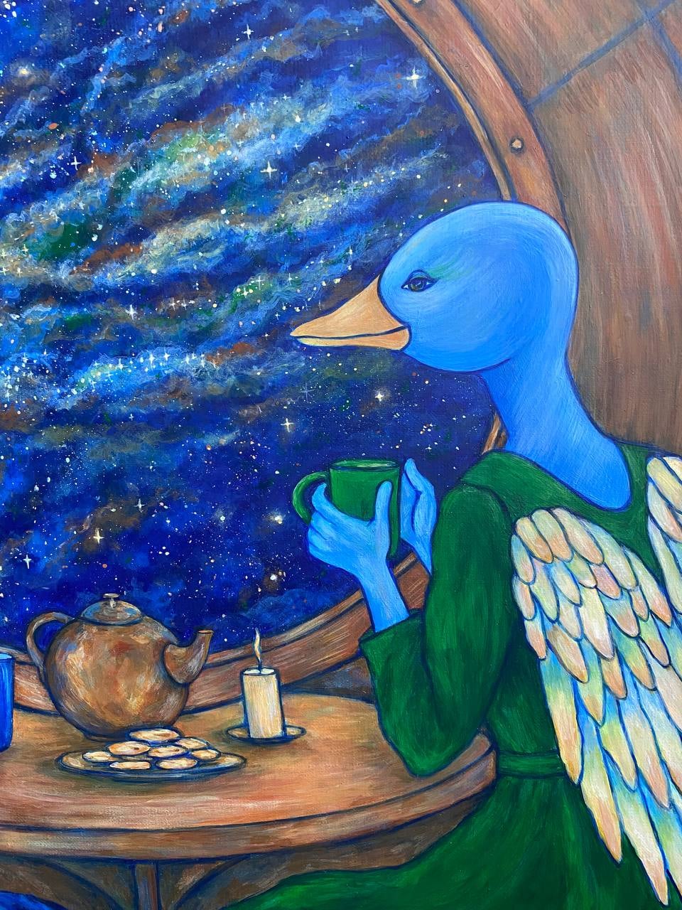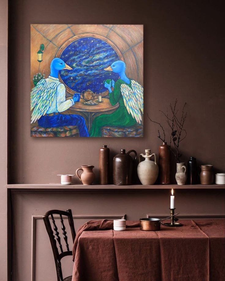 О чем картина: Космос так велик, что в нём легко потеряться. Но они нашли друг друга — и этого достаточно. За круглым столом, в свете далёких солнц, он понимает: галактики безымянны, пока не встретишь ту, ради которой захочешь дать имя всему вокруг.