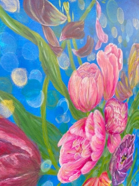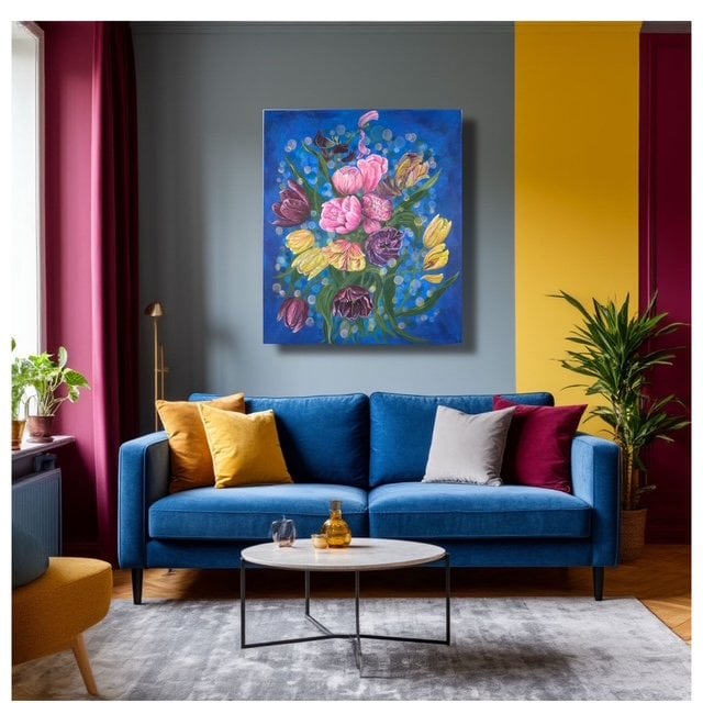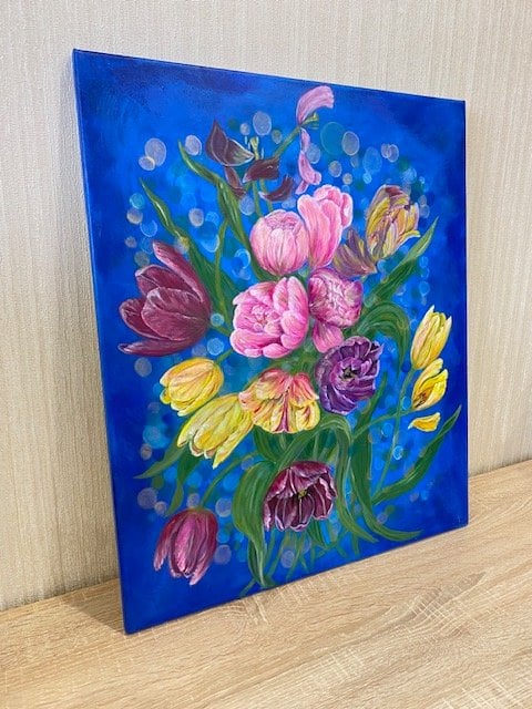 Весенние тюльпаны, словно ветром поднятые, дышат движением и свободой. Лепестки колышутся на неуловимом воздухе; каждый цветок — спутник ветра, раскрывая историю розового, желтого, лилового и зелёного. Фон — просторное небо и голубизна, где свет преломляется в боке, создавая искрящийся пух и далёкую звёздность. Боке задаёт глубину и пространство, как будто заглядываешь в весенний сад сквозь ткань времени. Концепция соединяет реализм с лёгким распылением краски: границы растворяются, тюльпаны — символ пробуждения и надежды. Эмоции: лёгкость, свобода, радость природы и тёплая ностальгия. Картина приглашает почувствовать дыхание весны, увидеть движение лепестков и шорох ветра — начало нового.Картина адресована ценителям современного цветочного натюрморта и абстракции, тем, кто ищет весеннее настроение в интерьере, любителям ярких акцентов, дизайнерам и владельцам гостиной, спальни или кабинета, нуждающимся в свежем акценте. Картина в единственном экземпляре, имеется сертификат подлинности.