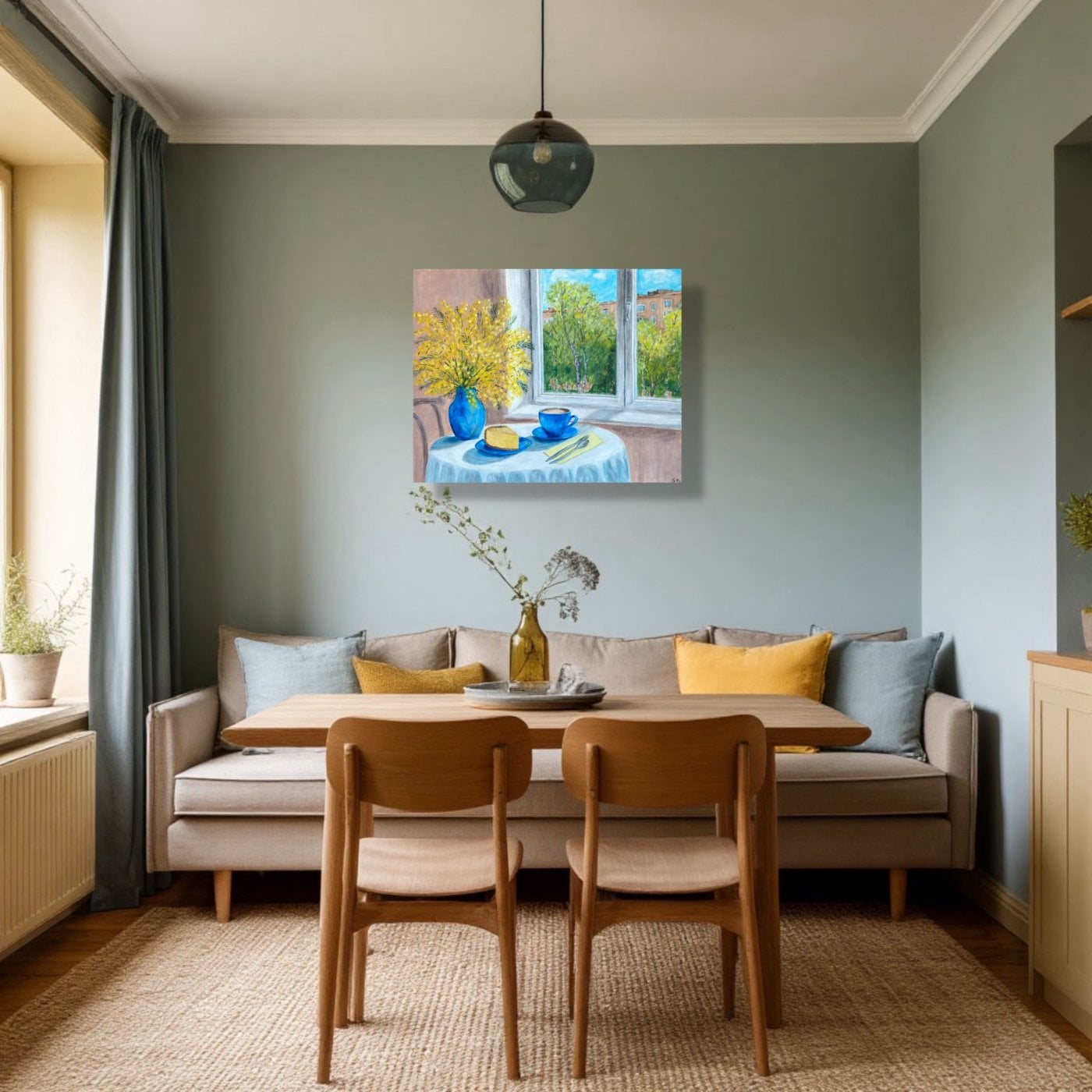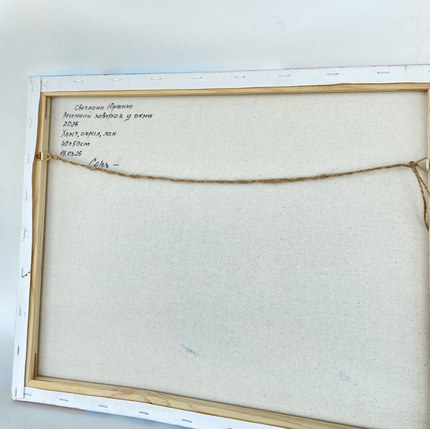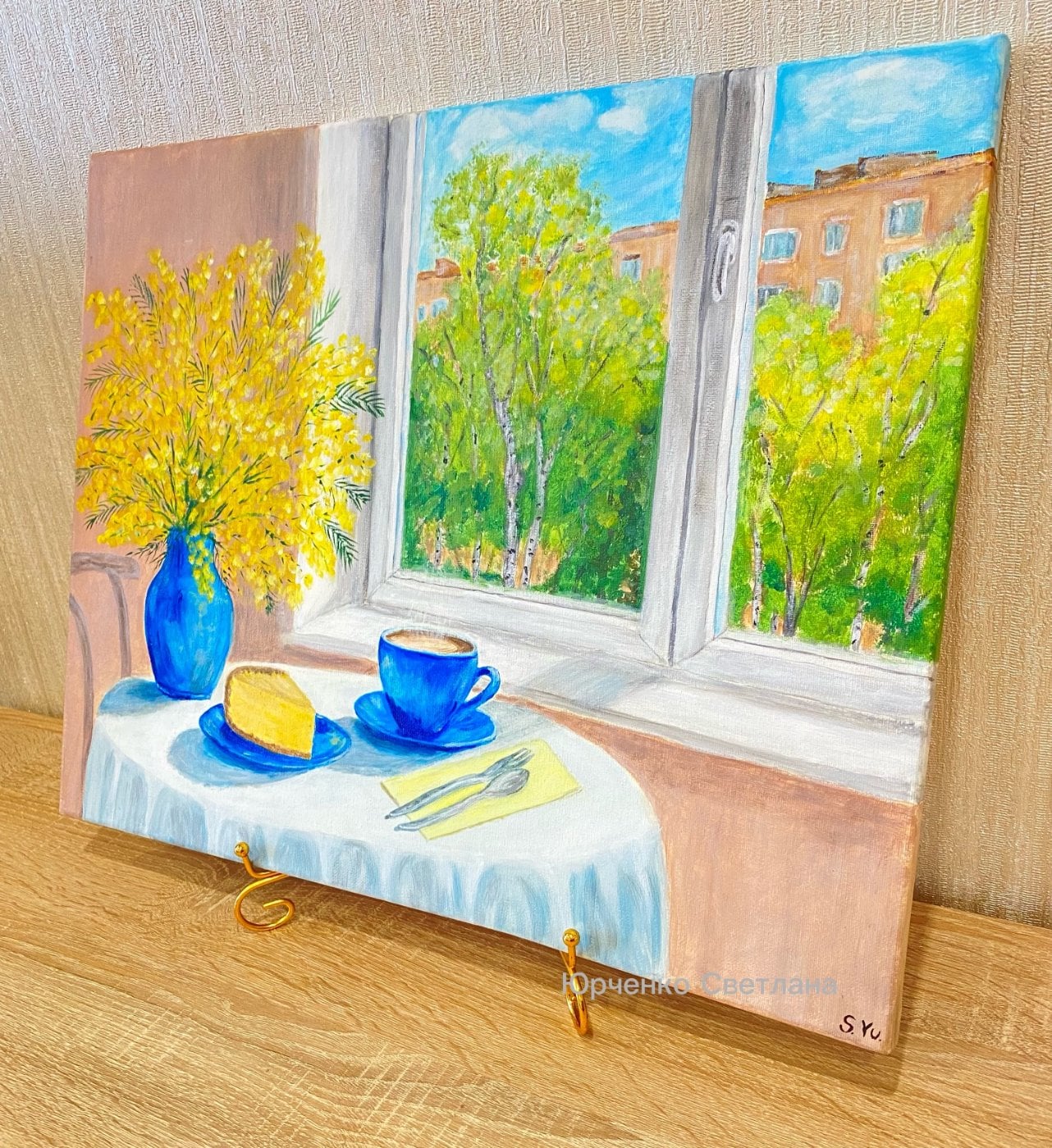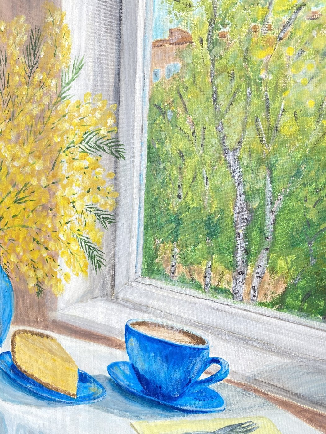 Светлая, наполненная воздухом композиция передаёт ощущение пробуждения природы и тихого утреннего уюта. Через раскрытое окно в комнату вливается весна: сочная зелень деревьев, мягкий солнечный свет и голубое небо создают атмосферу обновления и гармонии. На переднем плане — нежный натюрморт: яркий букет мимозы в синей вазе, чашка кофе и кусочек пирога, словно приглашение остановиться и насладиться моментом. Картина наполняет пространство лёгкостью, теплом и ожиданием новых начинаний, характерных для весны. Торцы прокрашены, являются картины. Оригинал, имеется сертификат подлинности.