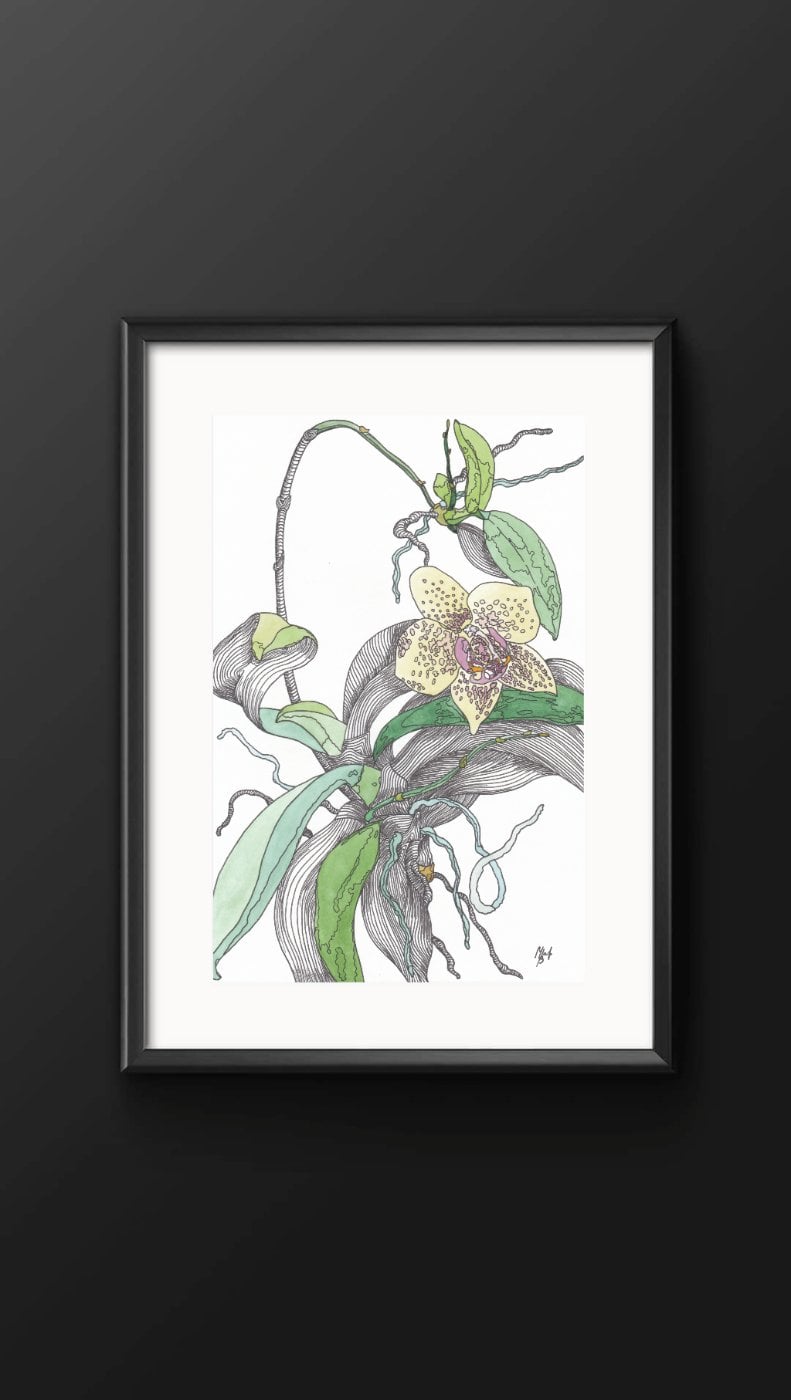 Картина серии "Орхидеи". Акварель, линеры. Оформление в чёрную аллюминиевую раму и белое паспарту 40х30 см.