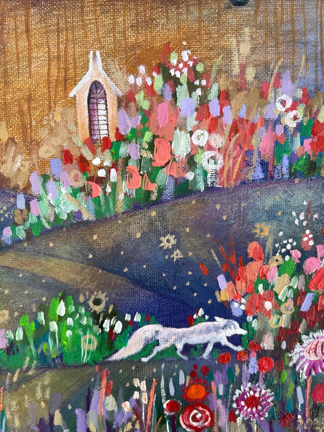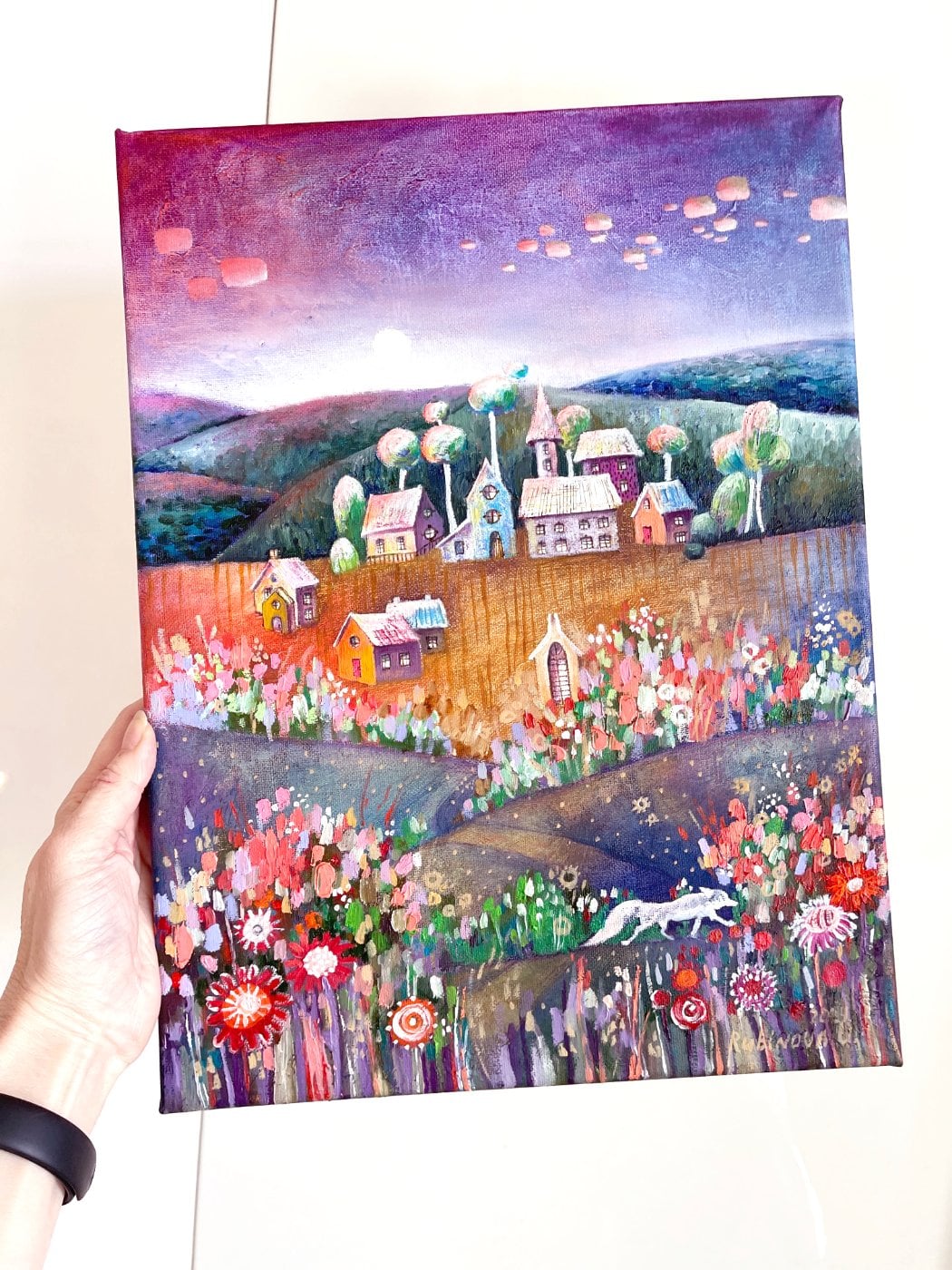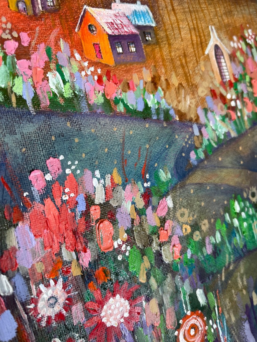 Картина с домиком на фоне фэнтази пейзажа. Текстурная, яркая, многоцветная.