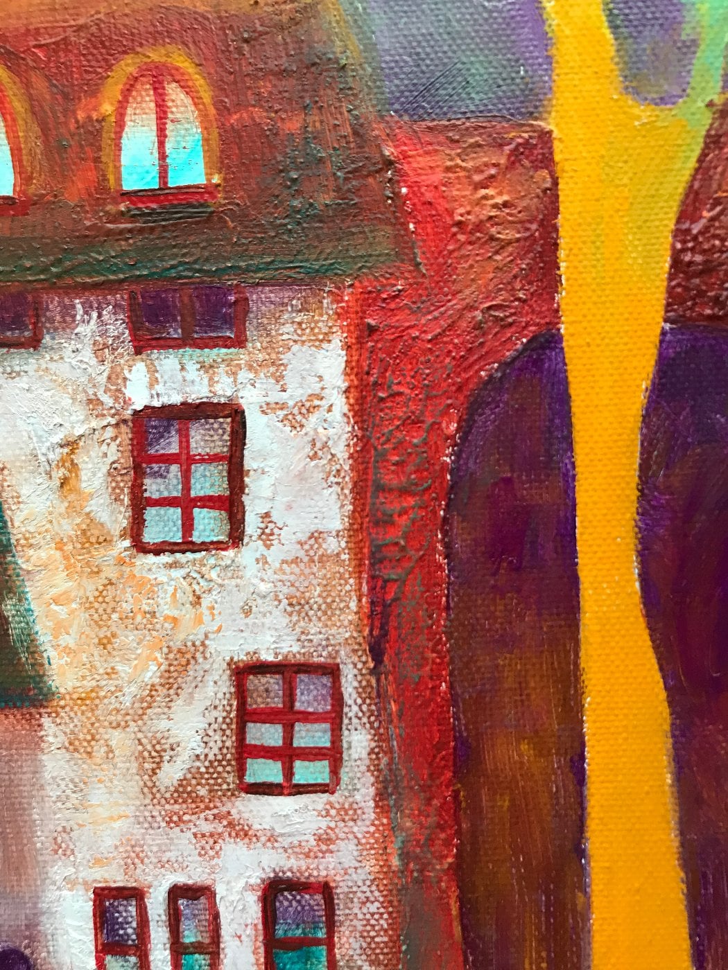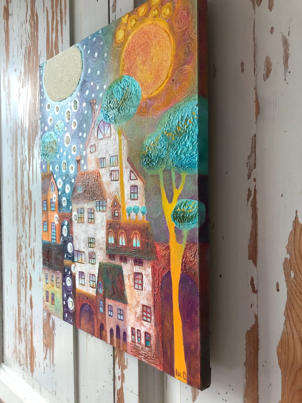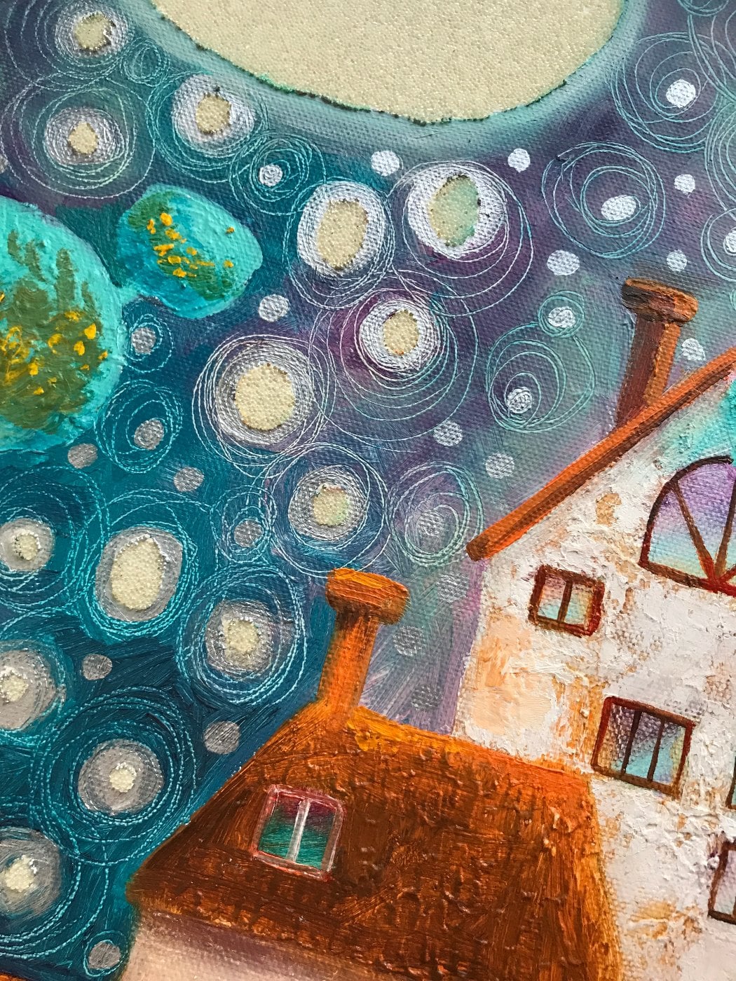 Сказочная картина выполнена маслом на холсте отличного качества 40 х 50 см. Очень текстурная живопись и конечно маленькие стеклянные шарики красиво сверкают под определенным углом.