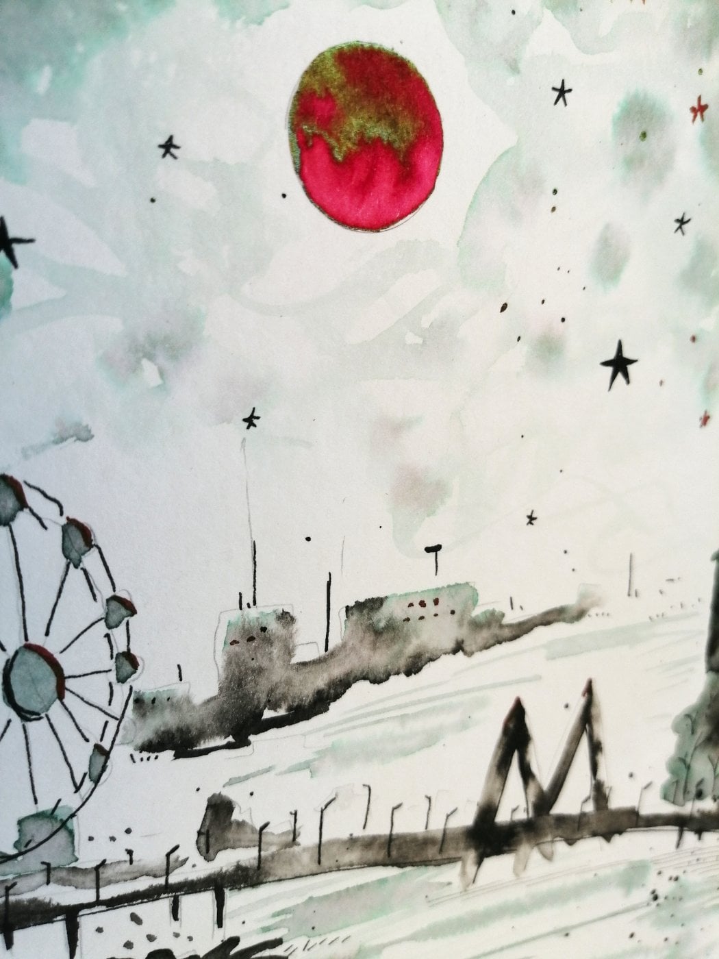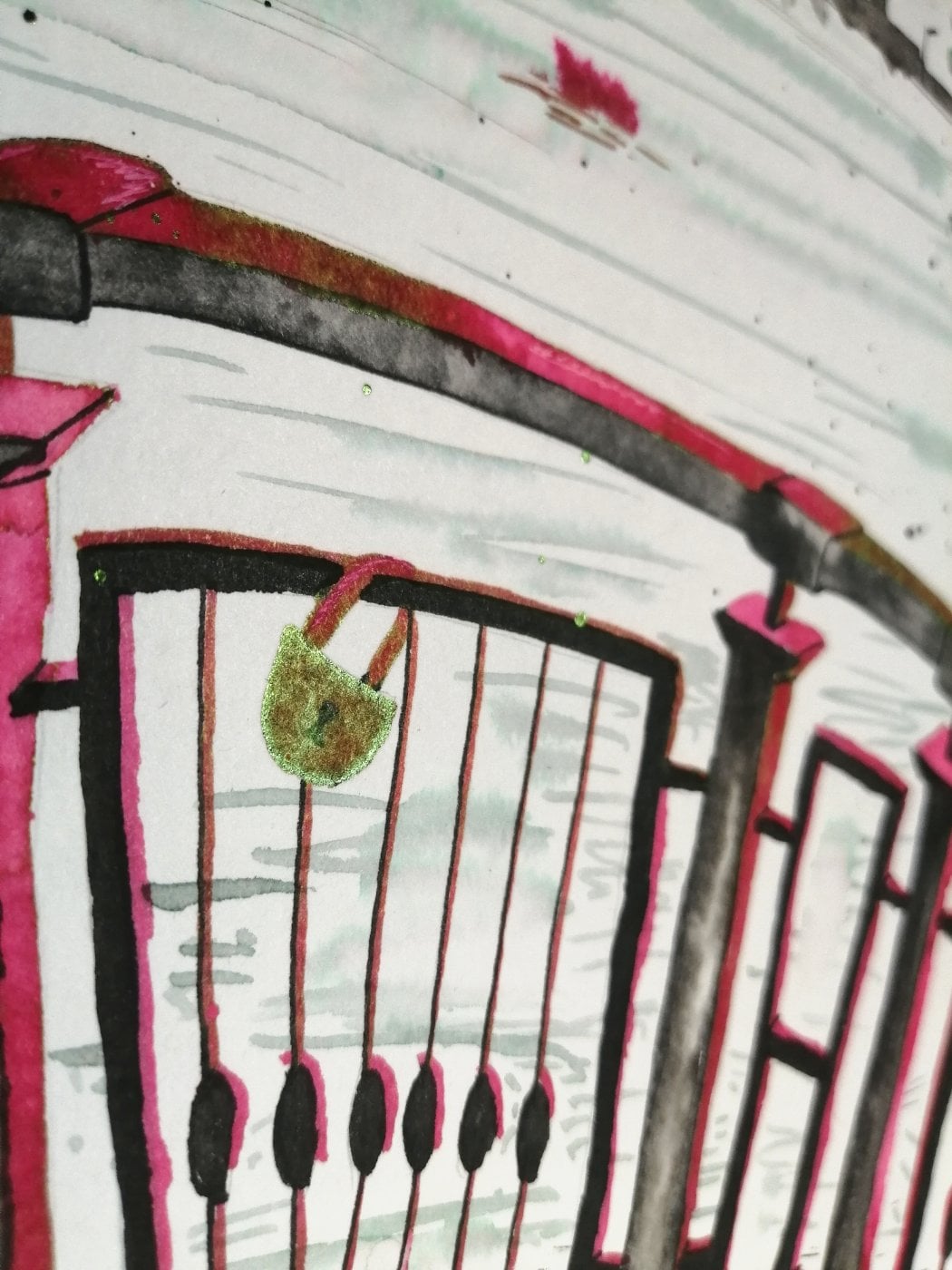 Материалы и техника: картина выполнена с использованием распадающихся чернил с блеском, туши и линеров на акварельной бумаге. Насыщенные чернила дают блеск-перелив в некоторых местах.