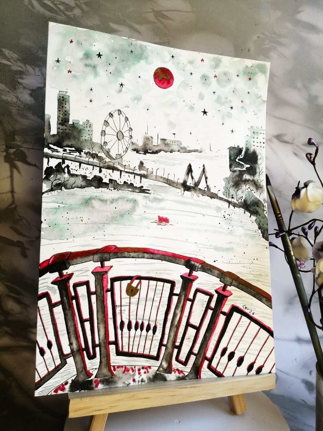 Картина написана не с натуры, а по впечатлениям от прогулок по Казани. На картине изображена набережная реки в полнолуние. Свет луны отражается от воды, создает контровой свет на перилах, а сама красавица-луна блестит из красного в золотой. Звезды в небе и замочек на перилах дополняют романтическую атмосферу.