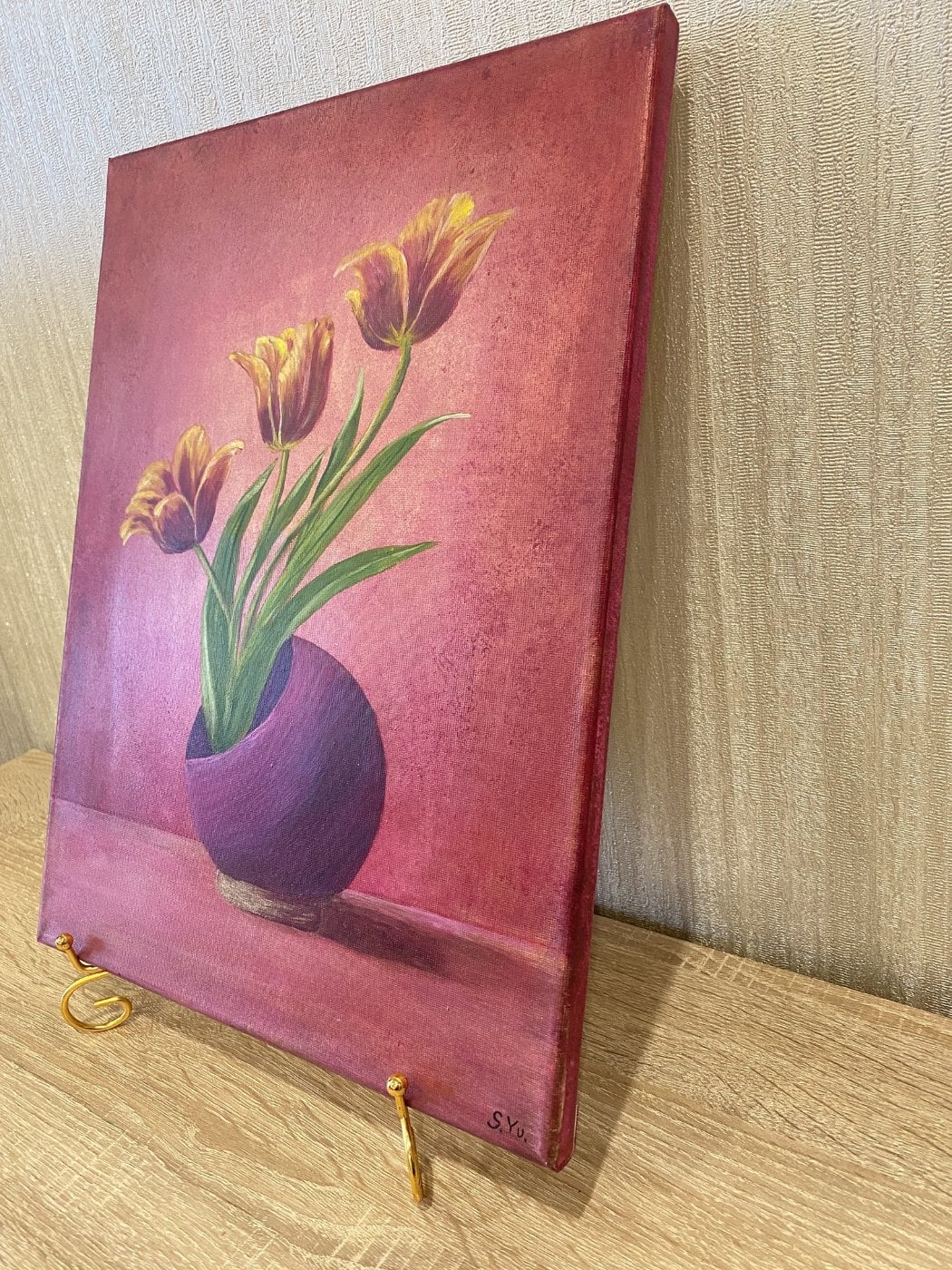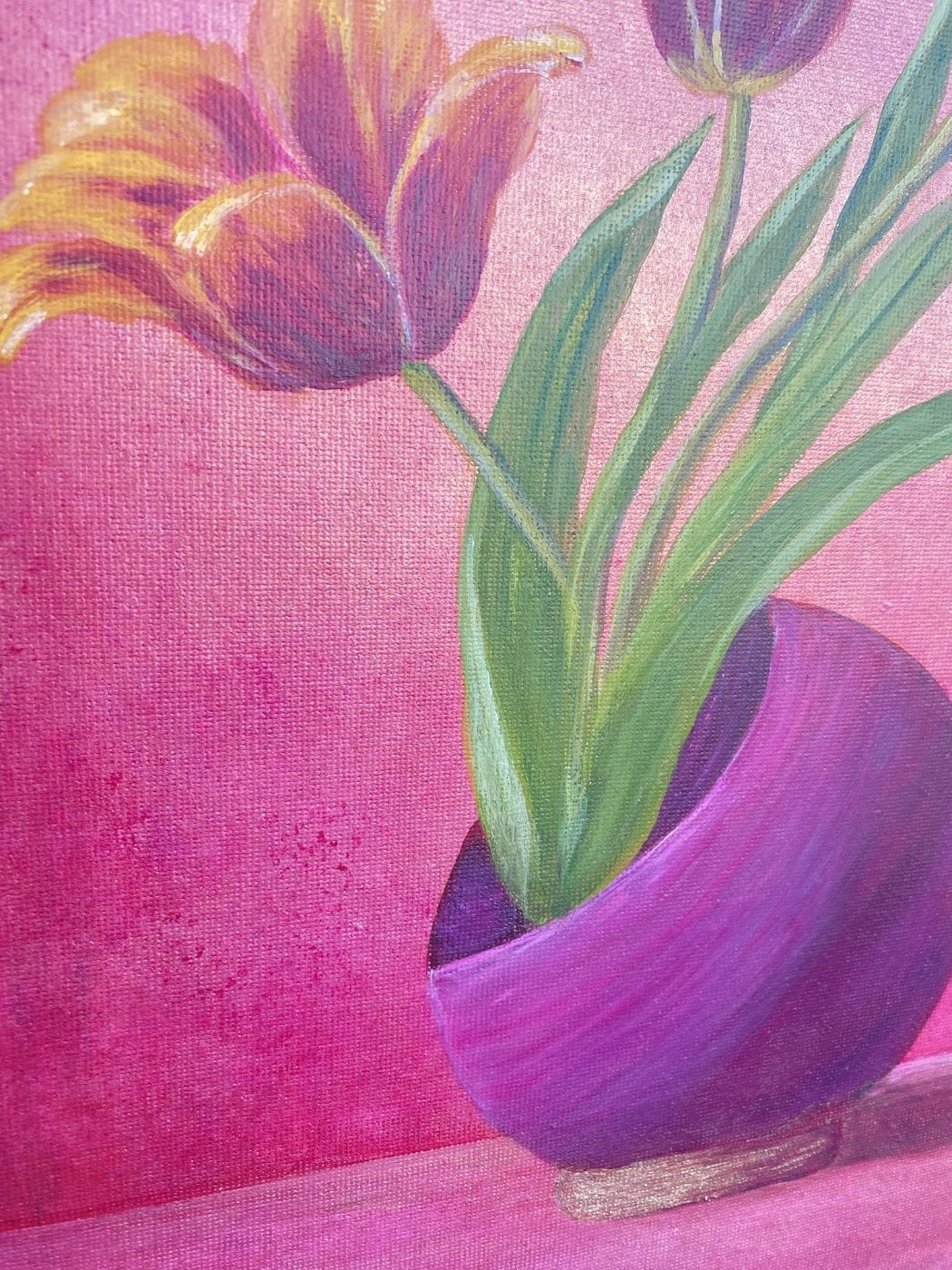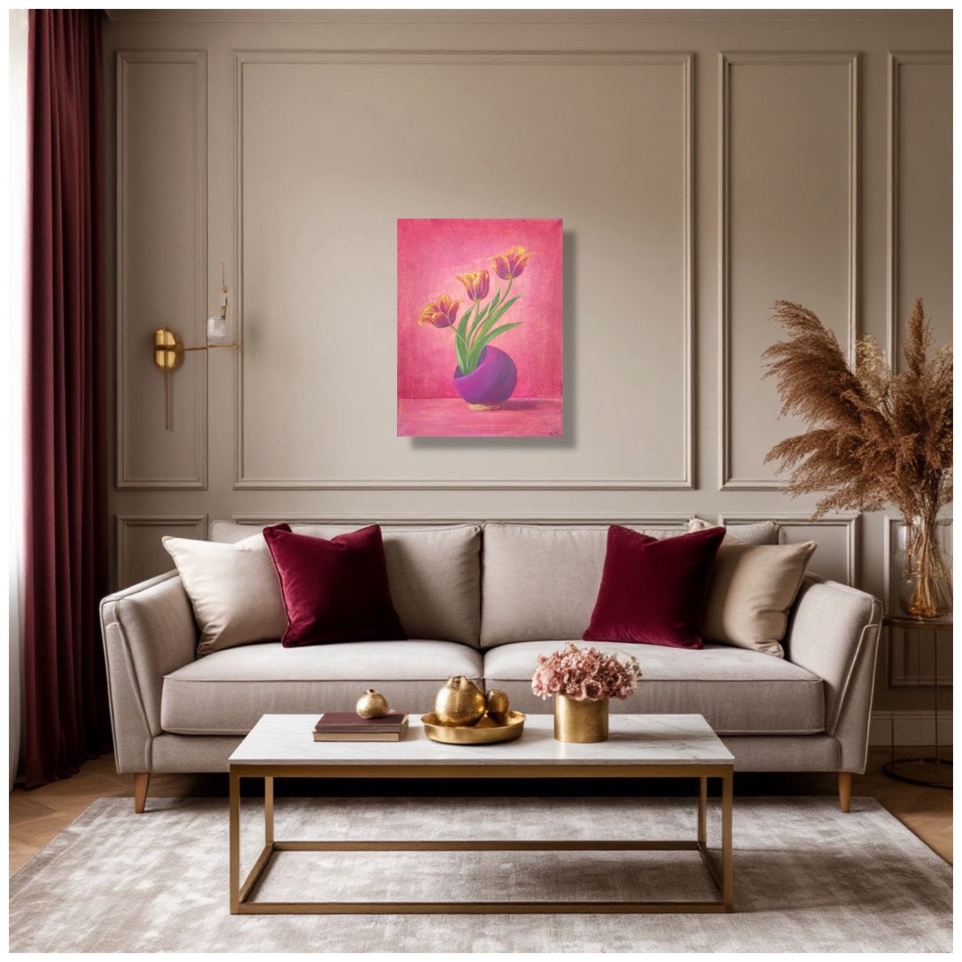 Концепция картины — простая красота в повседневности. Это стильный современный натюрморт, в котором обычные тюльпаны в небольшой вазе становятся главным акцентом, напоминая, что уют и гармонию можно найти в простых вещах. Тёплый розовато-красный фон создаёт ощущение света, тепла и спокойствия, а наклонённая ваза добавляет композиции живости и движения. Картина передаёт настроение тихого утра, домашнего уюта и момента покоя. Смысл работы — остановиться, замедлиться и заметить красоту рядом.